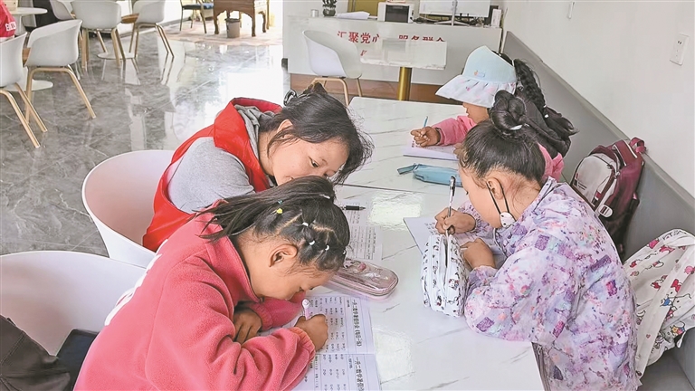 蔡公堂街道白定村党委开展的托班服务上,孩子们在认真写作业。