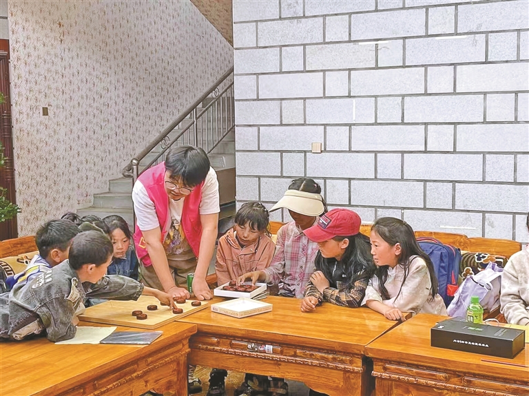 蔡公堂街道公堂社区开展的“小太阳”辅导班上,志愿者与孩子们下棋。