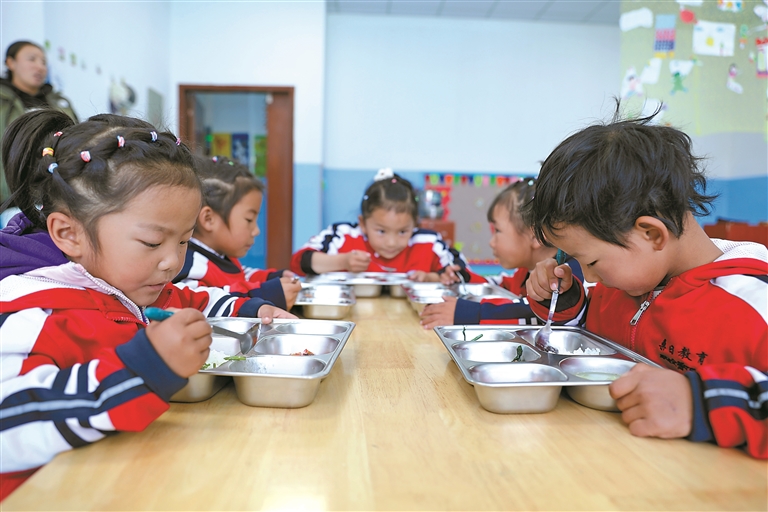 扎嘎新村的幼儿园里,孩子们正在吃营养餐。通讯员 侯勇 嘉措 摄