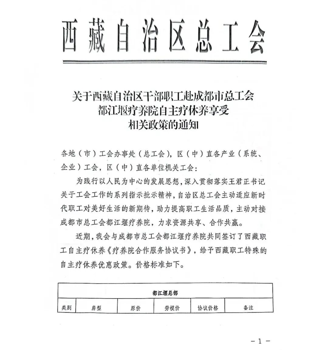 记者近日从自治区总工会获悉,为助力提高职工生活品质,自治区总工会与成都市总工会都江堰疗养院共同签订了西藏职工自主疗休养《疗养院合作服务协议书》,给予西藏职工特殊的自主疗休养优惠政策。