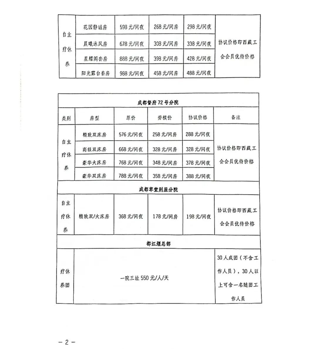 协议规定,西藏职工赴都江堰疗养院都江堰总部自主疗休养时,花园静谧房、晨曦沐风房、星耀阁套房、阳光露台套房的入住标准分别为298元/间夜、338元/间夜、428元/间夜、488元/间夜,其中劳模的入住标准分别为268元/间房、308元/间房、398元/间房、458元/间房;赴都江堰疗养院成都督府72号分院自主疗休养时,精致双床房、高级双床房、豪华大床房、豪华双床房的入住标准分别为288元/间夜、328元/间夜、378元/间夜、388元/间夜,其中劳模的入住标准分别为258元/间房、328元/间房、348元/间房、358元/间房;赴成都草堂别屋分院自主疗休养时,入住标准为198元/间夜,其中劳模的入住标准为178元/间房;西藏职工以30人成团(不含工作人员),或30人以上成团(可含一名随团工作人员)的疗休养团形式赴都江堰疗养院自主疗休养时,一院三址的入住标准均为550元/人/天。
