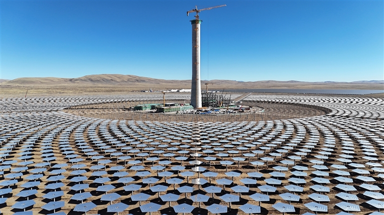 记者在施工现场了解到,该吸热塔配置近1.6万台定日镜,总采光面积超80万平方米,工人正在紧张有序安装,计划于明年3月搭建完毕,塔顶吸热器拟于明年4月安装完成。届时一座座五边形的定日镜,就像草原上的一朵朵“向日葵”,实时追踪太阳位置,将阳光反射至中央吸热塔,呈现“万镜朝阳、塔耀雪山”的壮丽景象,如同科幻电影里的场景,成为藏北高原上一座“亮眼”的绿色能源地标。