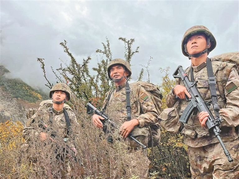 2025年11月,西藏军区某团一级上士次罗布(中)和战友们在巡逻途中观察前方路况。记者 丹增平措 摄