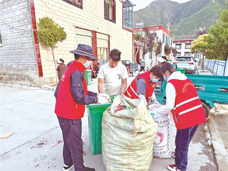 图为塘麦村党员在帮助村民搬运可回收垃圾。记者 武沛涛 丹增平措 摄
