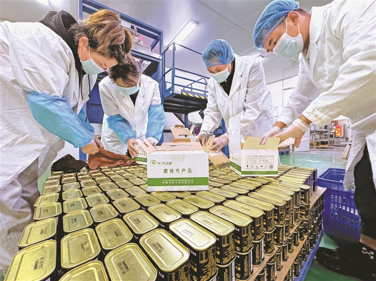图为林芝市工布江达县藏香猪产业园内,员工在对加工好的藏香猪肉罐头进行分类打包。