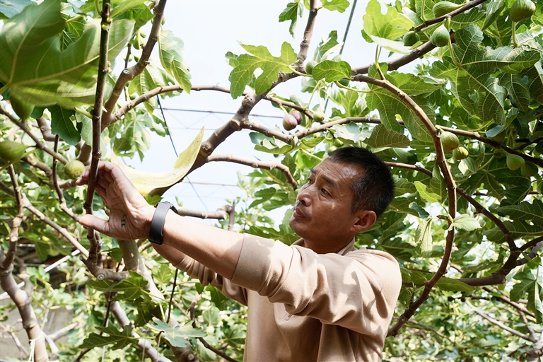 张广涛正在示范无花果采摘技巧。