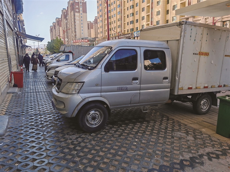 11月18日上午11时,正是商铺迎客的黄金时段,嘎吉林六区南侧商铺街的景象却让人忧心忡忡。街道地面铺设有绿色“8”字砖,黄色“8”字砖划定的停车位一直延伸到商铺门口,然而实际停放情况却与规划背道而驰——多数车辆未按标线停放,纷纷向路边挪动,直接占用了盲道与人行道;个别车辆更是紧贴商铺大门停放,将入口堵得严严实实,顾客只能从两车间隙小心翼翼穿行。更有部分商铺占道经营,把商品摆到门口,让整条街道显得杂乱拥挤,通行与经营秩序双双陷入混乱。