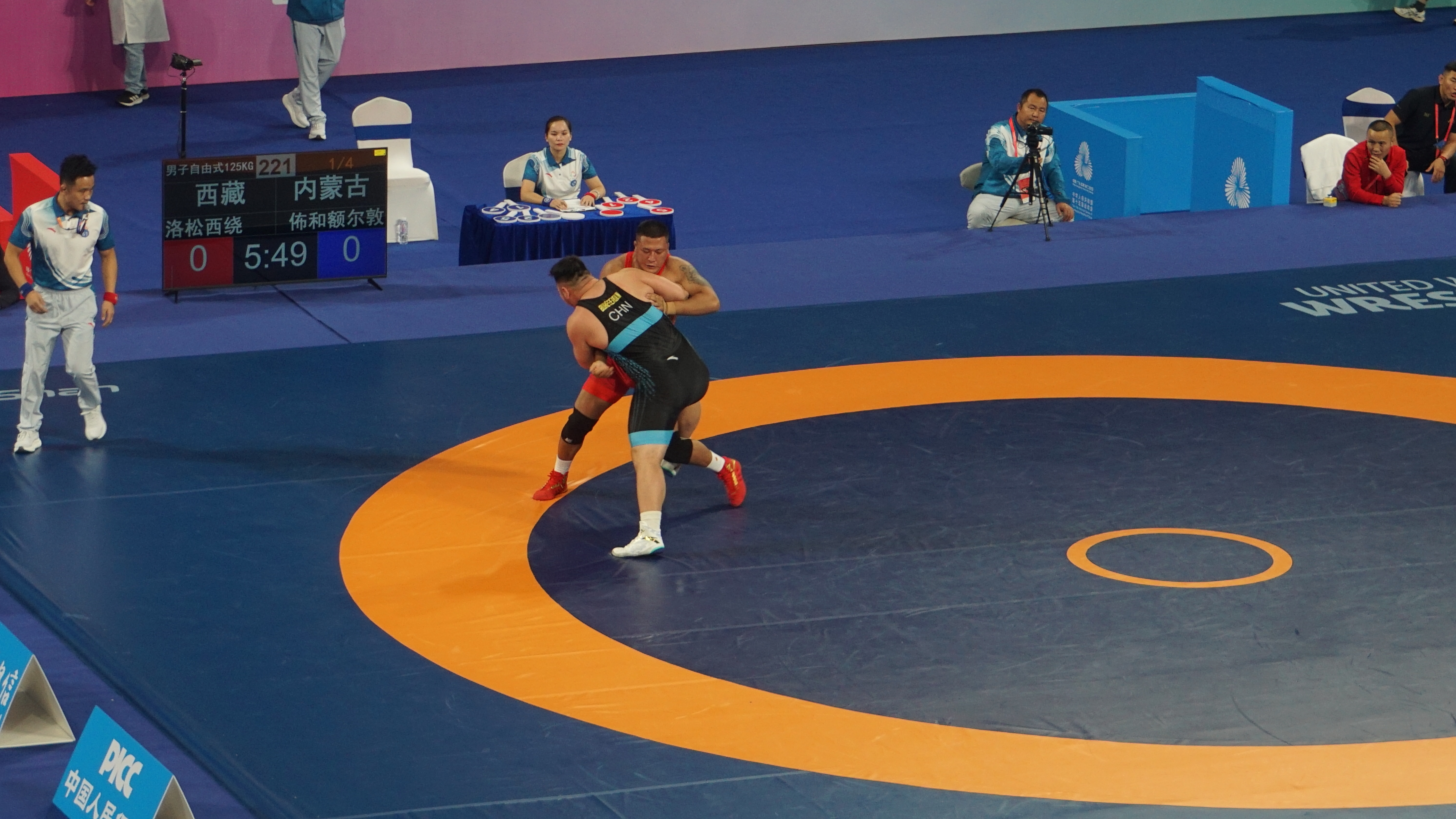 图为我区运动员洛松西绕(红色队服)参加男子自由式摔跤125公斤级比赛。记者 郑璐 晓勇 明吉 摄