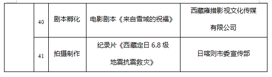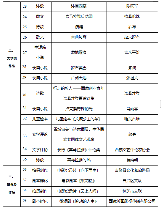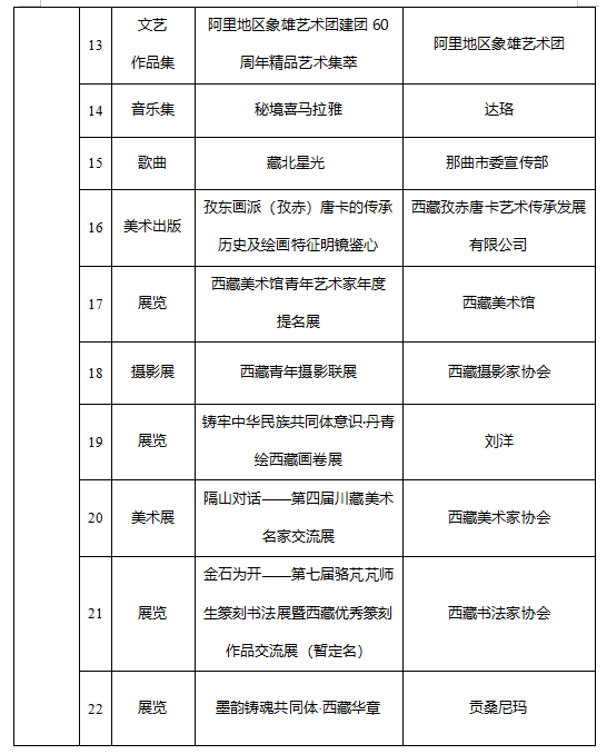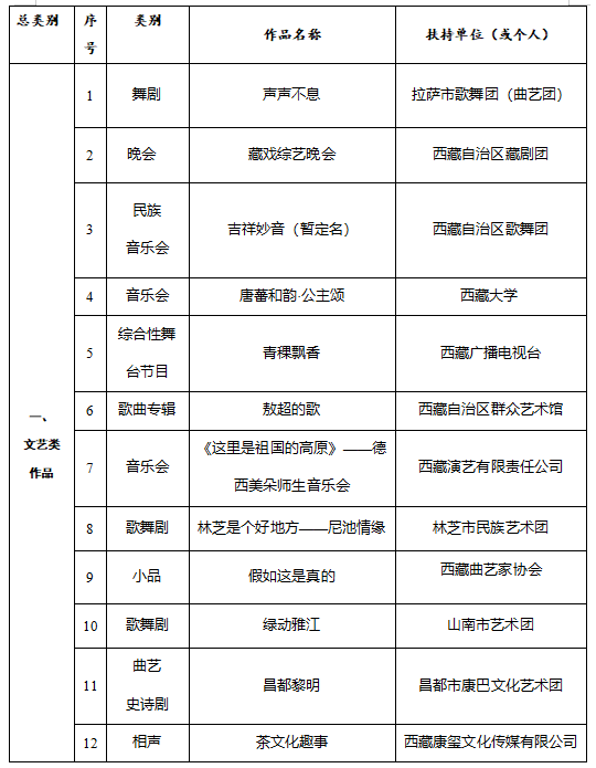 为深入贯彻落实党的二十大和二十届四中全会精神,贯彻落实习近平文化思想,贯彻落实习近平总书记关于西藏工作的重要指示和新时代党的治藏方略,全面落实自治区党委关于繁荣发展文艺事业的工作要求,聚焦“四件大事”聚力“四个创建”,团结引领广大文艺工作者坚持以人民为中心的创作导向,创作推出一批思想精深、艺术精湛、制作精良的文艺精品,根据《西藏自治区文艺创作扶持与奖励办法》(藏党宣〔2021〕38号)规定,经2026年度文艺创作扶持项目评审专家委员会严格评审,并报自治区党委宣传部部务会批准,确定西藏自治区2026年度文艺创作扶持项目共计41项。其中,文艺类作品22项,文学类作品13项,影视类作品6项。现对入选项目名单进行公示。