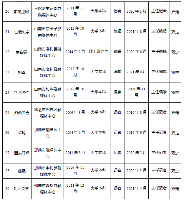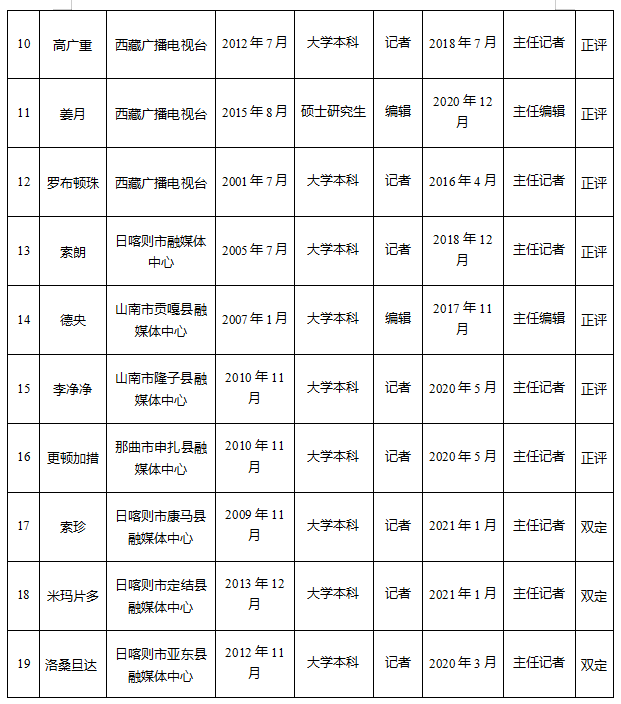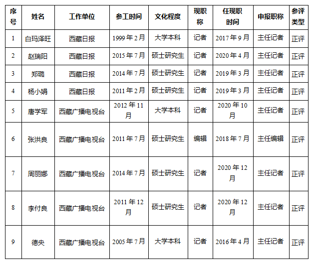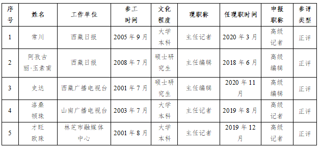 2025年12月2日,西藏自治区党委宣传部组织召开2025年度新闻系列高级职称初评会,对申报新闻系列高级职称的34名参评人员进行了认真评审。经专家评审,34名参评人员通过初评,拟参加2025年度新闻系列高级职称评审会。现将参评人员名单予以公示。