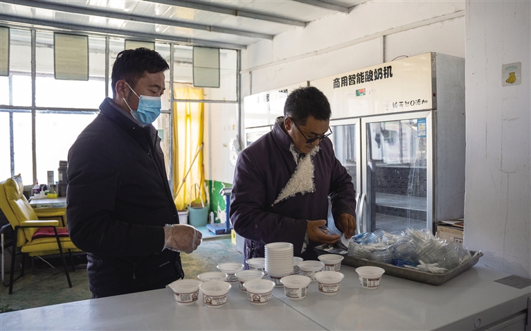 普尼玛(右)正在检查酸奶包装。