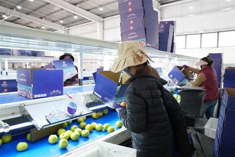 除了田间基地,苹果产业链的延伸还为群众带来了更多就业选择。位于洞嘎镇巴基塘的智能化苹果分拣车间于今年新建落成,车间内流水线高效运转,工人们熟练地分拣、装箱、搬运苹果,空气中的果香愈发浓郁。据车间负责人介绍,近期正忙着为电商平台备货,每天有16名工人负责打包1200余箱苹果;因发货繁忙,车间还额外雇佣了当地临时工,让农闲群众多了一份收入。