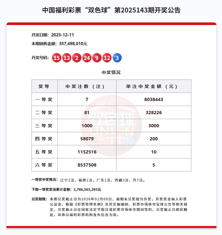 12月11日,福彩双色球第2025143期开奖,我区拉萨市墨竹工卡县54010158号销售网点喜中3注一等奖,单注奖金803.84万元,总奖金高达2411.52万元,这也是我区福利彩票今年中出的最高金额大奖。