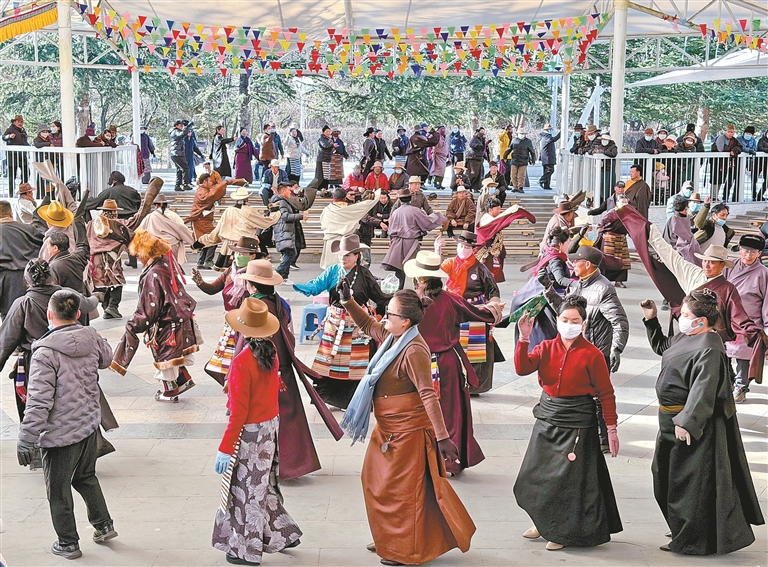 在拉萨市布达拉宫脚下的宗角禄康公园,每天清晨都有很多市民聚集在一起跳锅庄。歌声、笑声与晨鸟鸣叫交织,勾勒出一幅全民健身、乐享生活的温暖画卷。