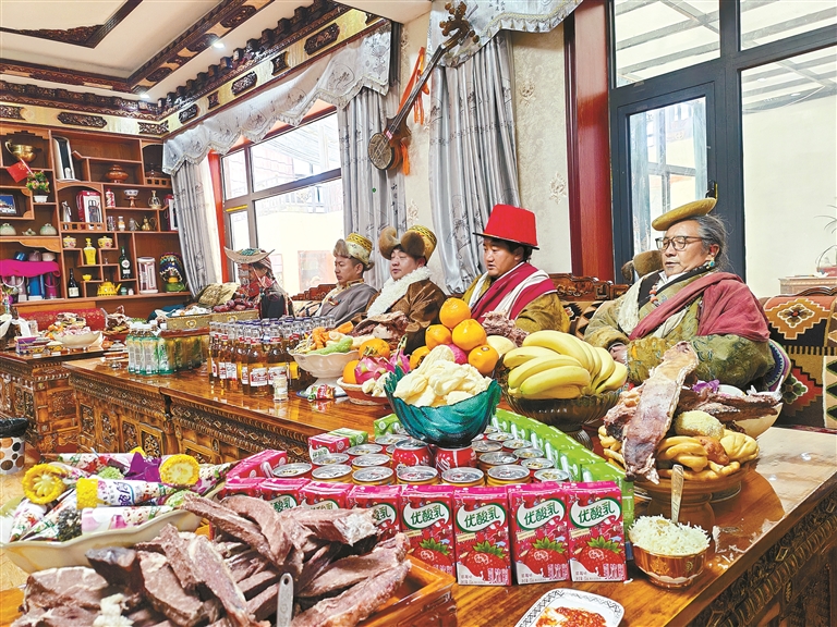 图为普兰新年当日,西德村村民旦成益西一家身着普兰传统服装,家中桌案年货丰盛,团圆迎新年。记者 永青 本报通讯员 多吉坚参 摄
