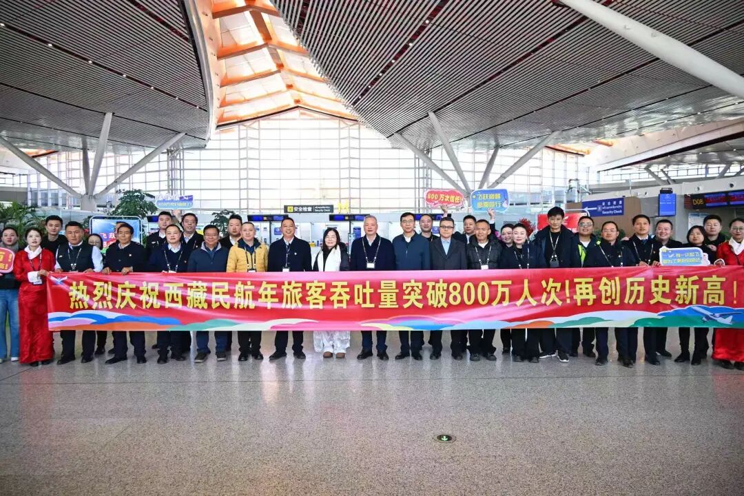12月29日,拉萨贡嘎国际机场抽取了第800万名幸运旅客,工作人员与旅客合影。