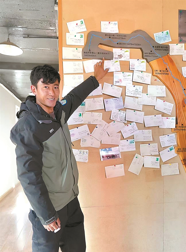 图为管护员嘎玛顿珠向记者展示长江流域模型板上的姜根迪如冰川。 记者 万靖 摄