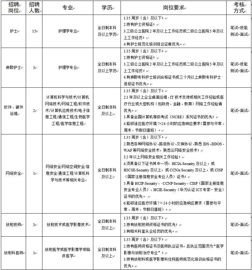(四)面试(时间另行通知)。原则上按笔试/操作考试成绩及招聘岗位1:3的比例进入面试。护士岗位按照笔试30%、技能测试40%、面试30%的权重计入综合成绩,其他岗位按照笔试50%、面试50%的权重计入综合成绩。按综合成绩及招聘岗位1:1的比例进入体检程序。