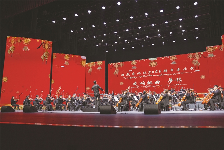 2025年12月30日晚8时,西藏自治区2026新年音乐会在西藏大剧院奏响发展新声。本场音乐会由西藏自治区党委宣传部指导,自治区文化和旅游厅、西藏广播电视台主办,西藏自治区歌舞团、藏剧团及西藏演艺有限责任公司承办,特邀中央歌剧院指导,西藏自治区歌舞团、藏剧团与中央歌剧院交响乐团联合演出,以“以古照今 乐动新年”为主题,将历史厚重与时代温度熔于一炉,为现场观众献上兼具精神洗礼与艺术享受的听觉盛宴,以文艺之姿迎接2026年的到来。