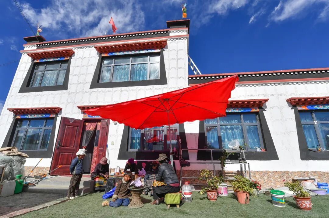 如今,这片土地的景象已截然不同。崭新的藏式房屋整齐排列,白色墙壁在高原阳光下格外明亮。屋顶的五星红旗在微风中轻轻摆动,像是这片土地重新恢复的脉搏。