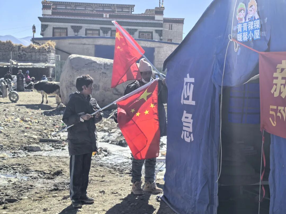 2025年1月14日,定日县长所乡嘎布村村民在临时安置点的帐篷上挂国旗。