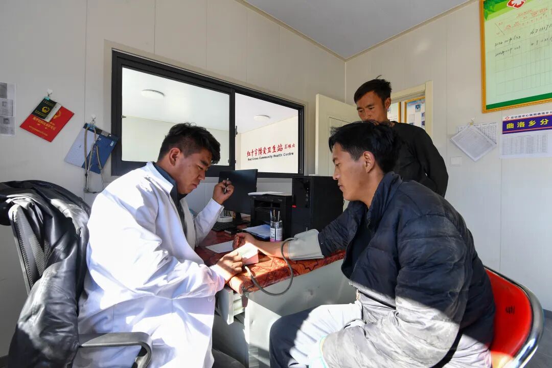2026年1月1日,定日县曲洛乡措昂村新建的卫生室内,村医西绕(左一)在为村民量血压。