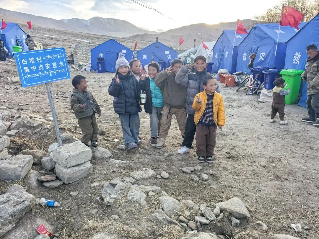 2025年1月15日,定结县郭加乡白堆村的孩子们在临时安置点帐篷前合影。