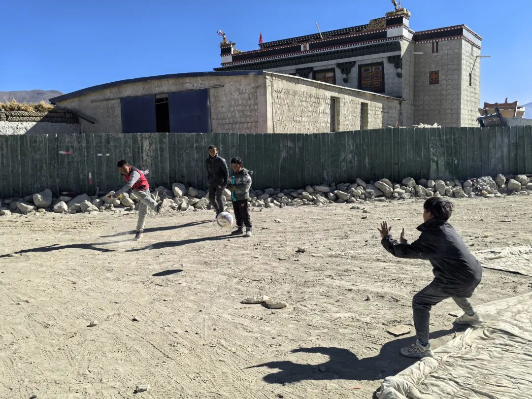 2025年1月14日,定日县长所乡嘎布村的孩子们在一片清理出来的空地上踢足球。