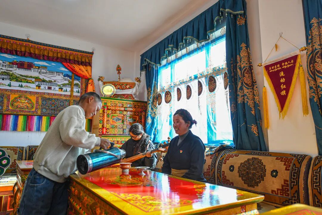 2026年1月2日,在拉孜县曲下镇土林村新房中,普布扎西(左一)为妈妈(右一)倒酥油茶。
