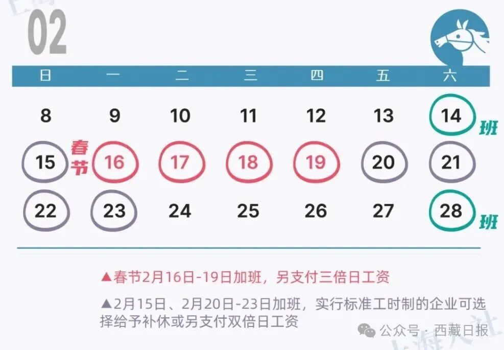 ■休息日为2月15日(小年夜)、2月20日(初四)至23日(初七),这5天用人单位安排劳动者加班,而又不能安排补休的,应按照不低于劳动合同规定的劳动者本人日或小时工资标准的200%支付劳动者工资。
