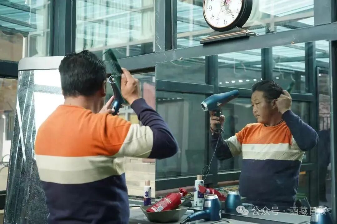 对着镜子,次仁郎加用吹风机徐徐整理头发,面容舒展,神采奕奕。“以前洗个澡,需要到镇里去,现在村里的澡堂很方便,想什么时候去都可以,特别方便。”次仁郎加笑着说。