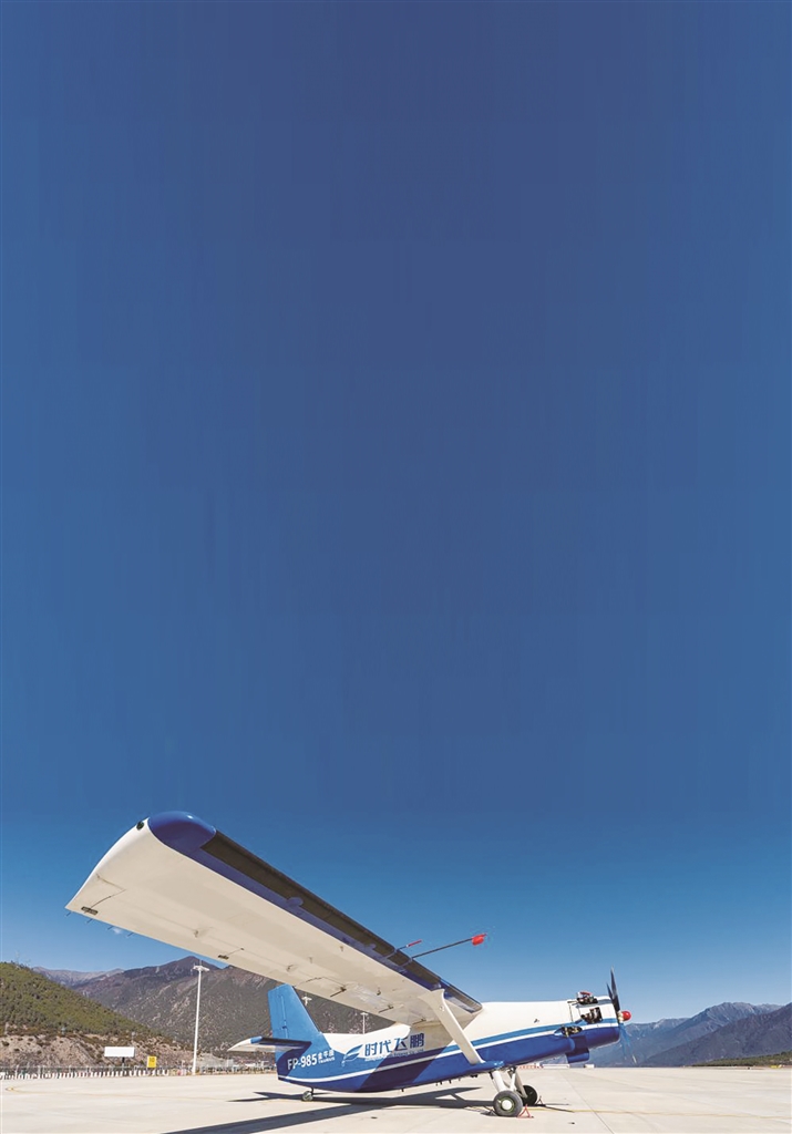 执行川藏高原跨区域无人机物流航线首飞的FP-985“金牛座”大型固定翼无人机。(新华社发)