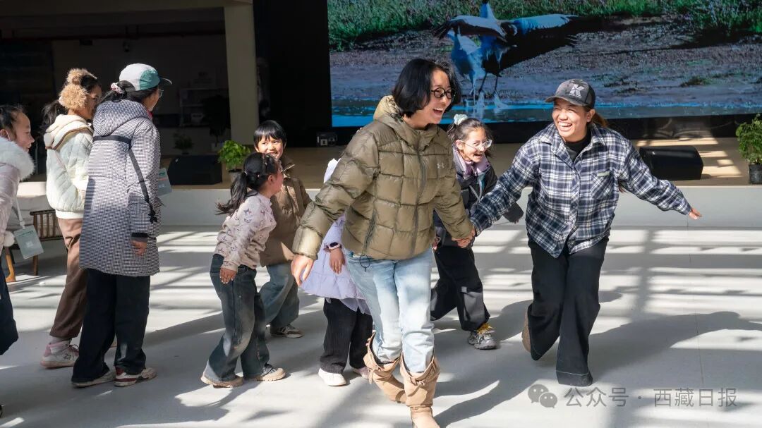 图为工作人员带领参加研学的学员们模仿黑颈鹤跳舞。记者 欧珠次仁 摄
