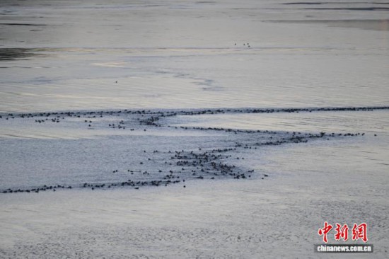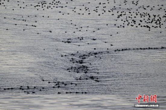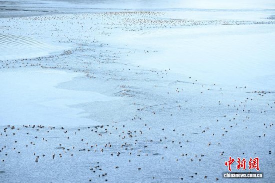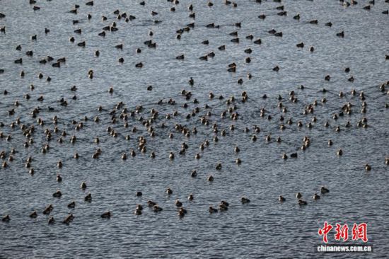 1月18日,成群的赤嘴潜鸭在沉错水域越冬。中新社记者 贡嘎来松 摄