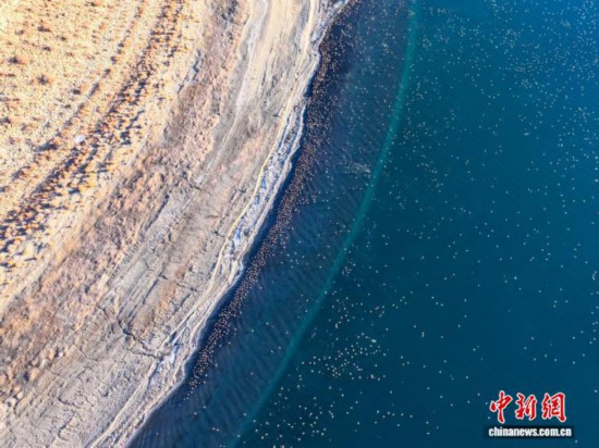 1月18日,成群候鸟在沉错水域越冬。(无人机照片)中新社记者 贡嘎来松 摄