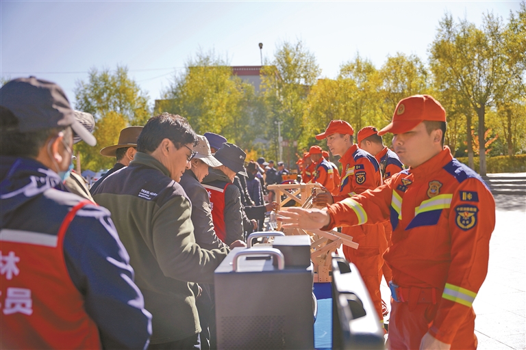 在资料发放环节,大队宣传员向过往群众递发《森林防火条例》摘要手册及防灾减灾科普折页等宣传资料200余份,确保防灾政策、防火常识广覆盖、无遗漏;案例讲解环节,宣传人员结合周边近年防灾减灾典型案例与森林火灾真实事件,用汉藏双语清晰解读违规用火、灾害应对不当的严重后果,明确违反相关规定的法律责任,让群众直观感受到防灾减灾与防火的紧迫性;装备展示区,专业救援车辆、灭火器材及救援装备逐一陈列,大队宣传员细致讲解各类装备的用途与操作原理,既充分展现应急救援实力,也有效加深群众对防灾减灾、防火救援工作的认知;有奖问答与答疑环节,通过趣味互动充分激发群众参与热情,针对家庭用火安全、日常防灾避险、林区作业防火等常见疑问,宣传员耐心解答、细致指导,做到有问必答、解惑到位。