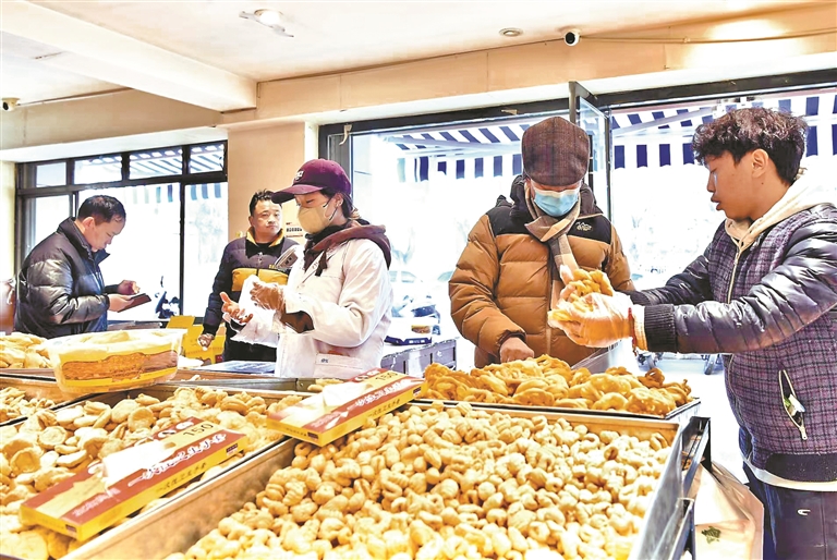 “卡塞”是一种油炸面食,是藏历新年必备的年货之一。椭圆形的“果子”、蝴蝶状的“耳朵”……各色造型的“卡塞”寄托着人们对团圆、富足的美好祈愿。店铺里,刚出锅的“卡塞”垒成小山,顾客络绎不绝。
