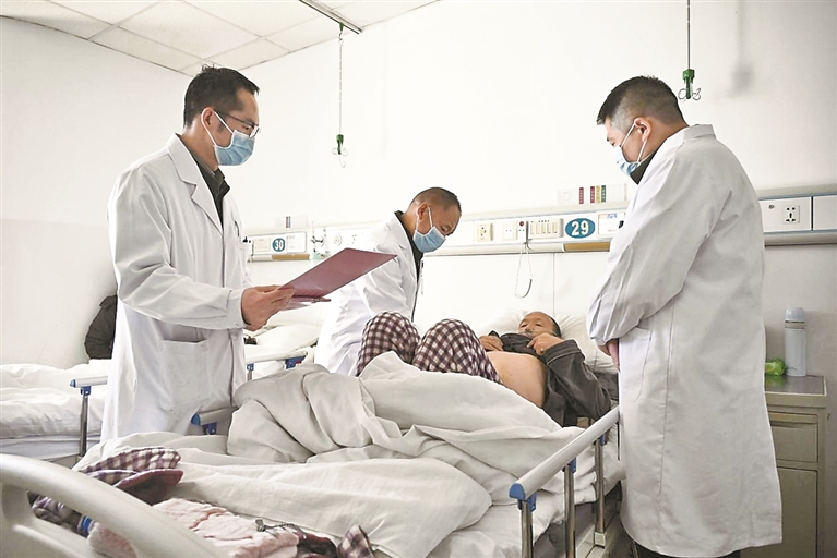 图为西藏军区总医院普通外科专家团队在查房,普布次仁医生(左二)对患者进行腹部检查。通讯员 西培多杰 摄