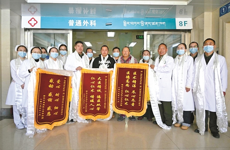 图为患者出院时给西藏军区总医院普通外科医疗团队赠送锦旗。通讯员 西培多杰 摄