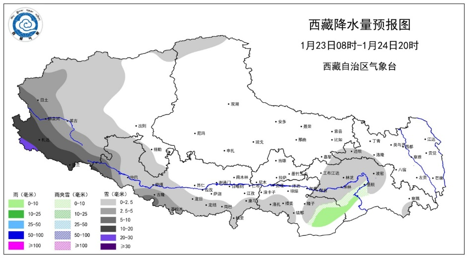 1月21日,自治区气象台发布天气消息。预计,1月23日,阿里西部和南部有小到中雪,部分地方有中到大雪,其中札达至普兰一带有大到暴雪;日喀则西部和南部有小雪(雨),部分地方有中雪。1月24日白天,日喀则西部和南部、阿里西部和南部有小雪(雨),部分地方有中雪。雪后有4~8摄氏度降温。在此期间,那曲、阿里东部、日喀则西部有8级左右大风,局地阵风可达10~12级。