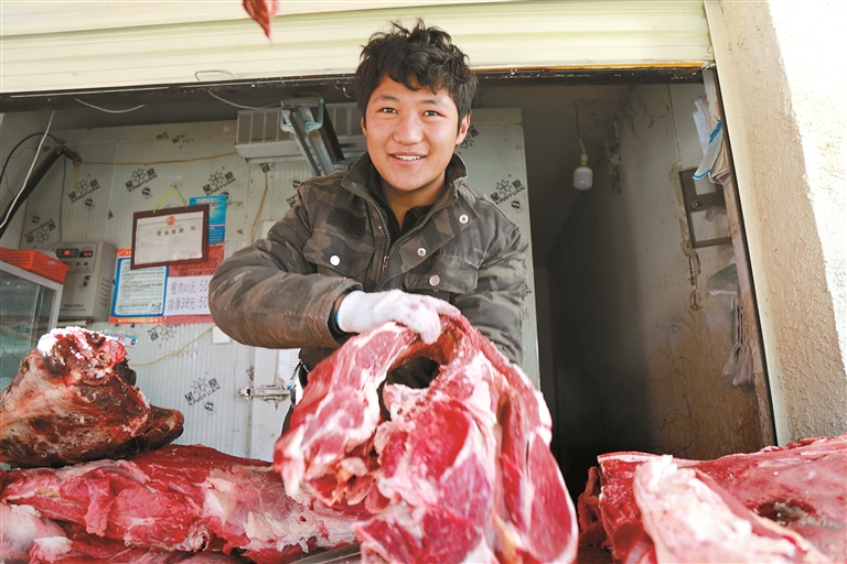摊主展示新鲜牦牛肉。记者 格桑伦珠 摄