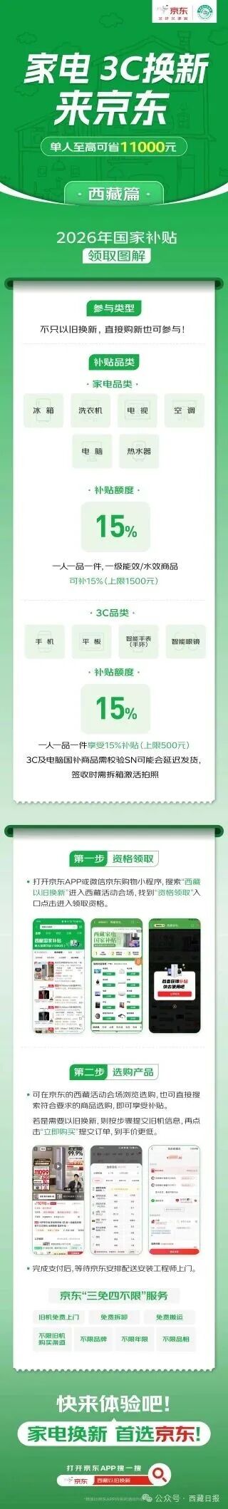 依托完善的仓配网络与服务体系,京东让高原消费者换新更省心。家电品类可享旧机回收补贴及“送、装、拆、收”一体化服务,“三免四不限”(即旧机免费上门、免费拆卸、免费搬运;不限旧机购买渠道、不限品牌、不限年限、不限品相)服务彻底解决旧机处理难题;3C数码产品送货上门时可同步完成现场签收与激活,实现足不出户换新机。京东物流网络覆盖西藏所有区县,偏远地区群众也能同步享受政策红利。