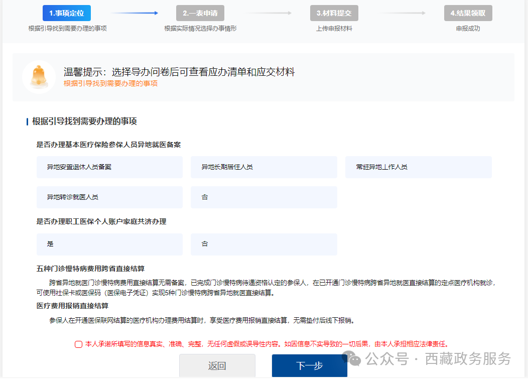 4.情形勾选:根据自身需求,勾选需办理的事项(如职工医保个人账户家庭共济、异地就医备案等),进入下一步。