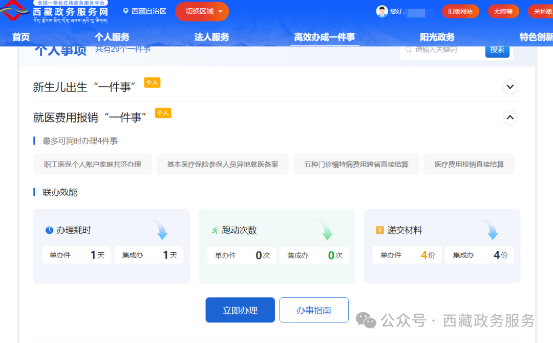 2.进入专区:首页找到“高效办成一件事”服务专区,点击进入“就医费用报销一件事”专栏,选择“立即办理”。