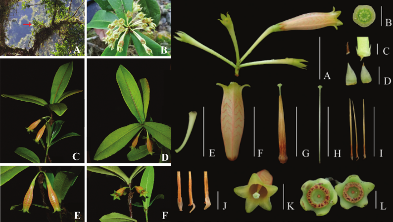 3.李成树萝卜(Agapetes lichengii Y.H.Tong & B.M.Wang):该物种为杜鹃花科树萝卜属成员,由中国科学院华南植物园等机构的研究人员发表于《PhytoKeys》。通过系统的花部形态学比较,研究团队确认其为新种。其与近缘种五柱头树萝卜(A.pentastigma)的主要鉴别特征包括:叶片基部钝圆或呈耳状、花冠基部收缩、花冠淡绿黄色具红色V形横纹、花药背面无距以及柱头裂片间无沟。该物种为附生灌木,目前仅发现于墨脱县低海拔热带雨林的林冠层,个体数量稀少,生境脆弱。