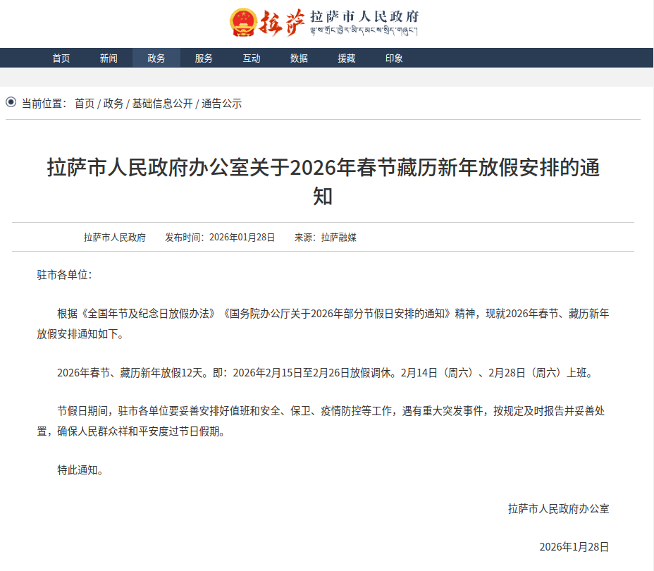 2026年春节、藏历新年放假12天