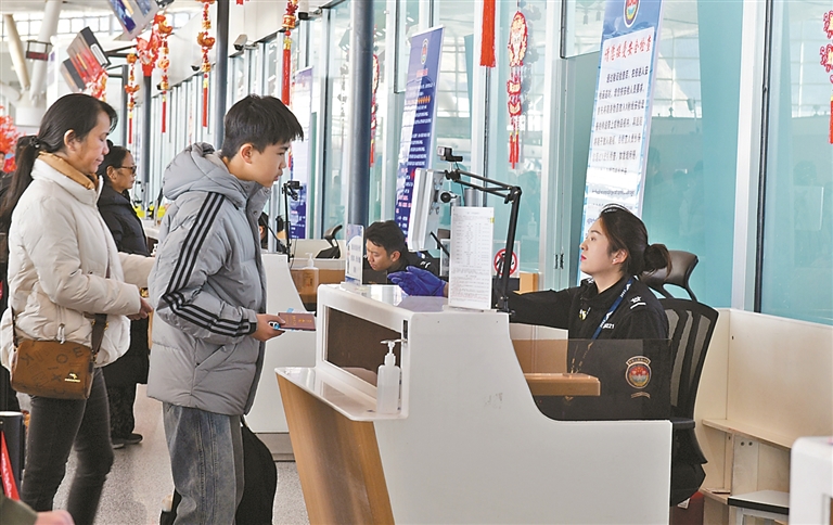 图为工作人员为旅客办理登机手续。记者 曲珍 摄