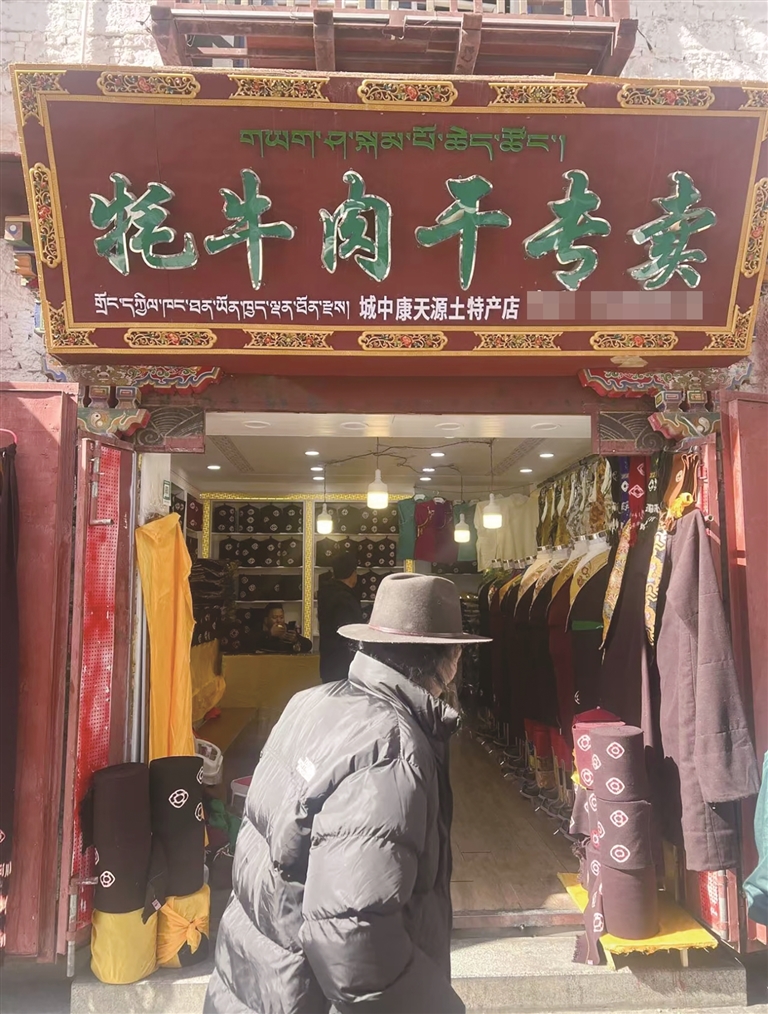 在一家原本售卖藏红花、贝母等土特产的店铺里,此刻堆满酥油、酸奶、风干肉。市民洛桑正挑选风干牦牛肉。他说,冬季气温低,适合储存干肉,而这些商铺的货源大多来自农牧区,品质有保障。“夏天这里卖旅游纪念品,冬天卖生活必需品,特别方便我们周边居民。”市民洛桑说。
