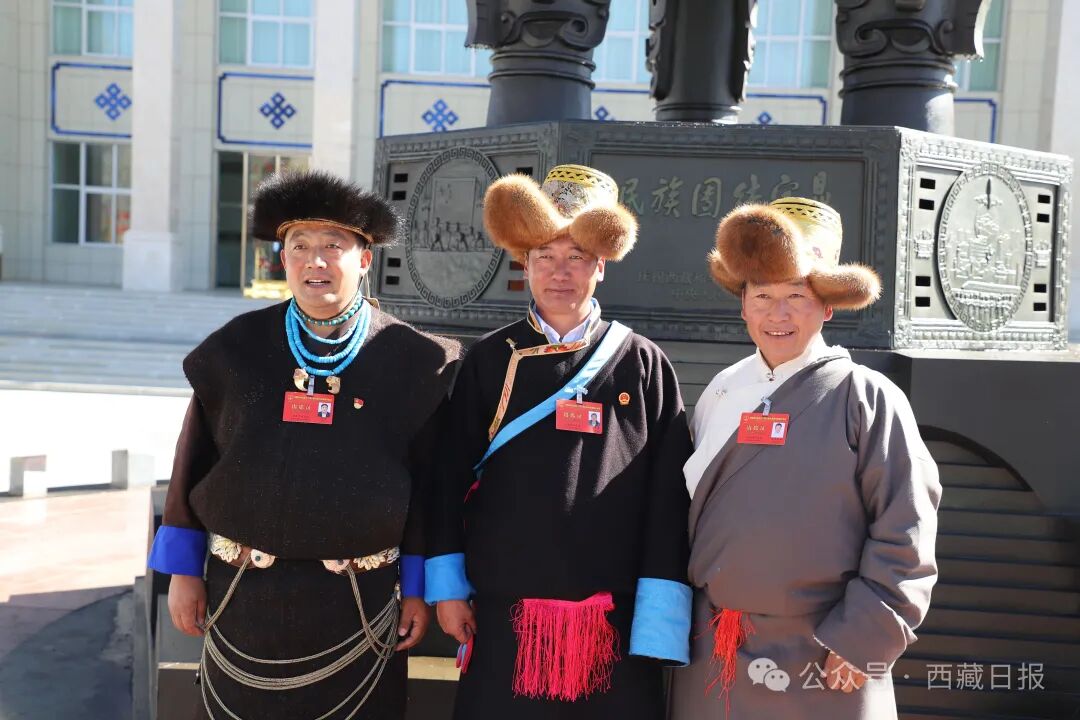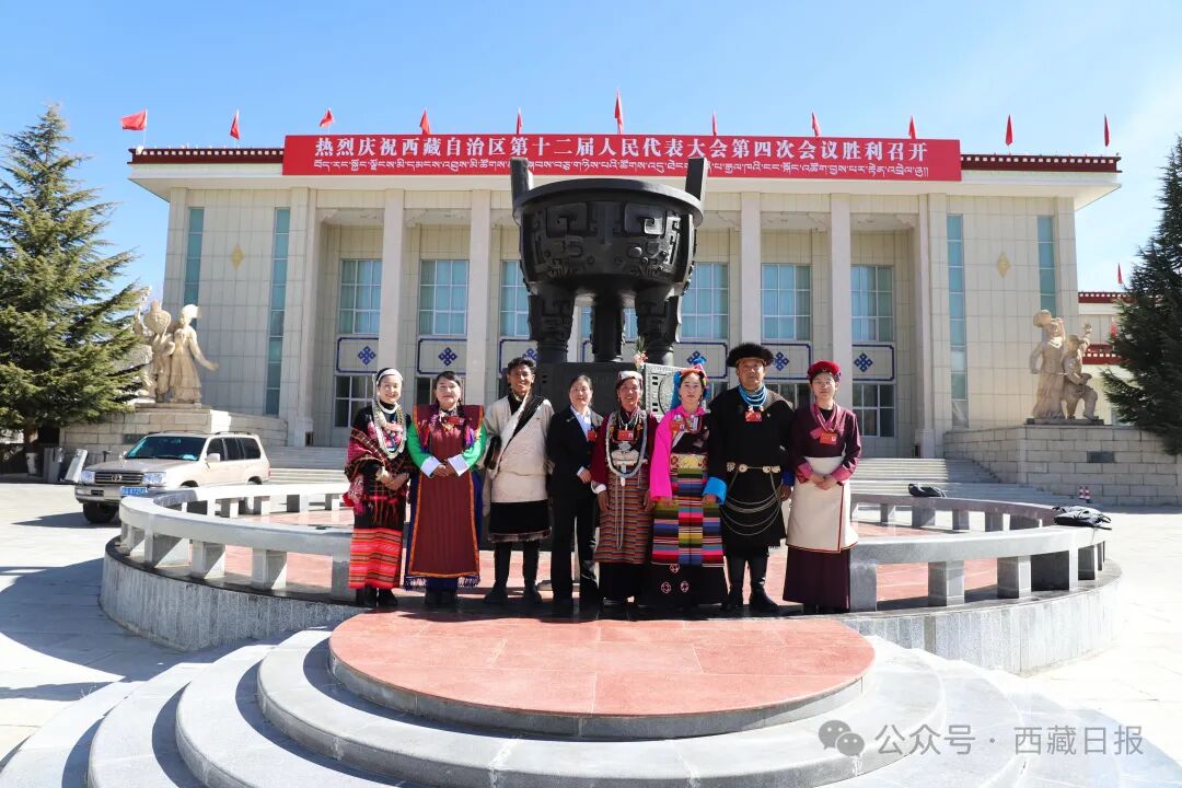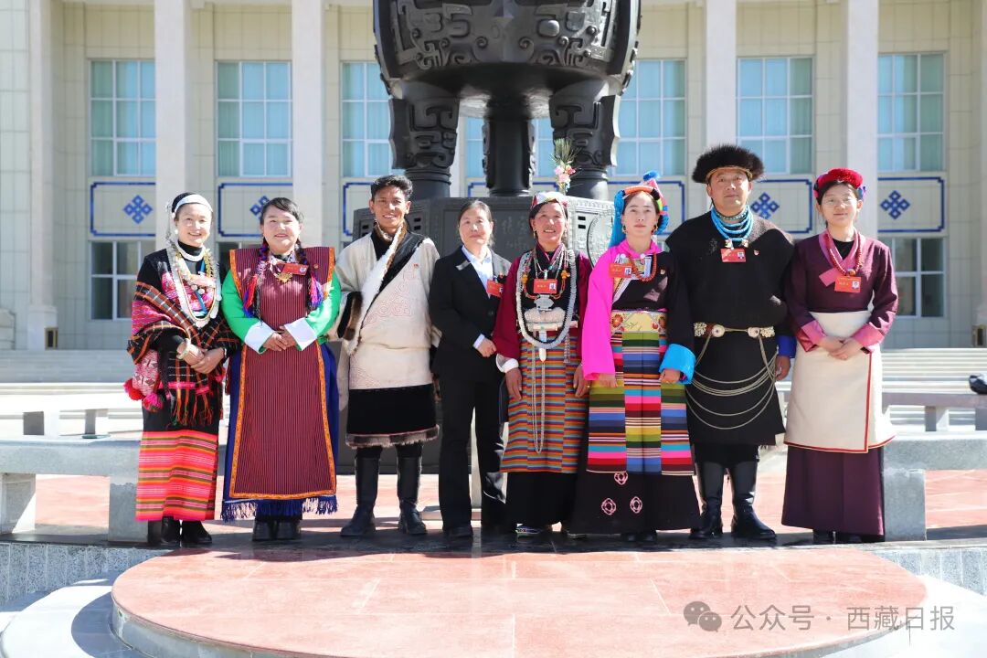 图为8位自治区人大代表在民族团结宝鼎前合影。左起:玉珍(僜人)、次仁普只(门巴族)、加凳(藏族)、成海宏(汉族)、仁增(夏尔巴人)、仁青措珍(纳西族)、达娃(珞巴族)、斗卓玛(门巴族)。