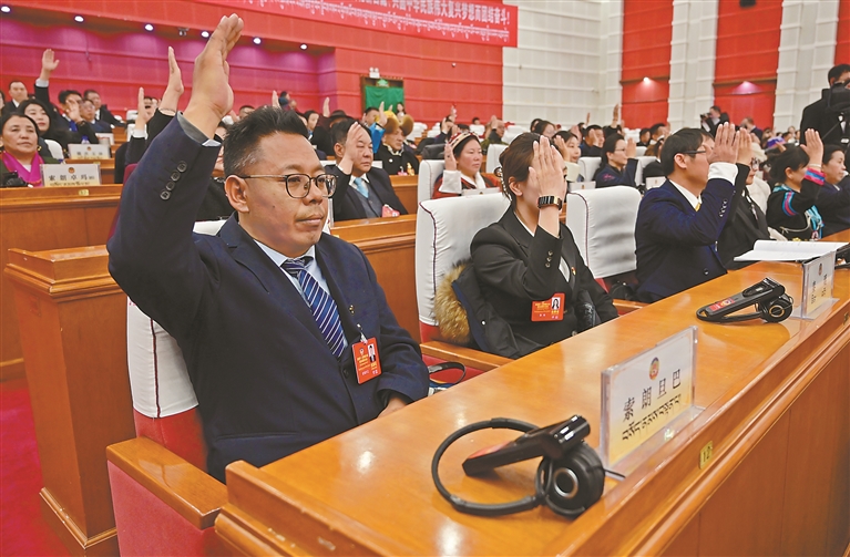 图为委员们举手通过自治区政协十二届四次会议选举办法。记者 唐斌 摄